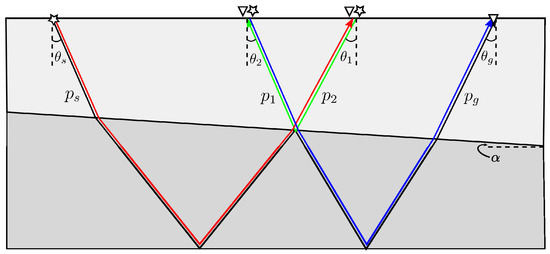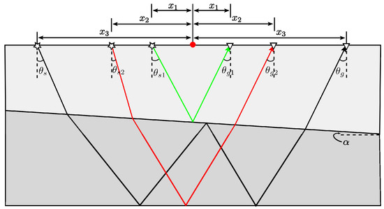 Before implementing internal multiple prediction using the 1.5D algorithm with dipping strata, it is necessary to investigate the inclination dependency of the 1.5D algorithm and to discuss the performance differences using different input types. To do this, while ensuring the simplicity of calculation, we create a two-interface model, where the shallower reflector is slant with a dipping angle (here, if the depth of the interface increases from left to right and vice versa), while the deeper one is flat. In addition, we numerically simulate all ray-paths of primaries and the first-order internal multiples on a two-interface model, as shown in Figure 2 or Figure 3.
