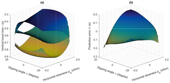 With the 1.5D prediction algorithm, the vertical traveltimes of the internal multiples are predicted by doubling the vertical traveltimes of the second primary events and then subtracting the vertical traveltimes of the first primaries, i.e., . Compared to the recorded internal multiples, the predicted errors with varying dipping angles and horizontal slowness are plotted in Figure 4b. Figure 4b demonstrates that for a common shot gather internal multiple prediction on dipping strata using the 1.5D algorithm, the absolute values of prediction errors dramatically raised (up to 0.2 s) along the increasing dipping angles and horizontal slownesses.