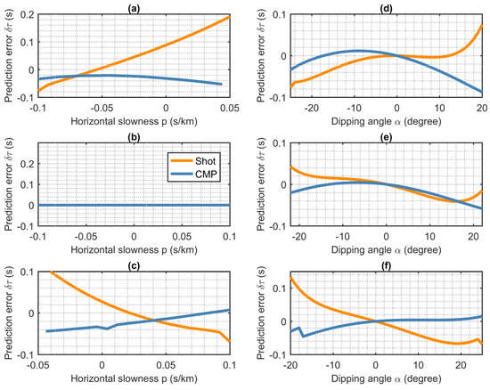 The prediction errors of using the shot and CMP gathers at the fixed horizontal slowness s/km are also extracted and plotted in Figure 6d–f, respectively. All predicted errors both in the shot and the CMP domain are zeros at dipping angle in Figure 6d–f, which agrees with the fact in Equation (3). However, at the fixed horizontal slowness, the prediction errors of using the shot and the CMP gathers do not show the linear relationship with varying dipping angles, and limited advantages may be found in the CMP domain.