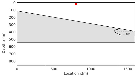 In this subsection, we numerically evaluate the performance of implementing the 1.5D prediction algorithm on the 2D cases. To do so, a three-layer model with one dipping reflector and one flat reflector is created and plotted in Figure 7. The velocities from top to bottom are (2200, 3500, 2200) m/s, and the dipping angle of the top interface is . A total of 640 shot gathers are generated with source locations moving from left to right and occupying each receiver location. All sources and receivers with a fixed interval of 2.5 m are located at the top surface of the model. The internal multiples generated by three reflectors in Figure 7 are reconstructed using the 1.5D prediction algorithm with the shot gathers and the CMP gathers, respectively, for comparison.