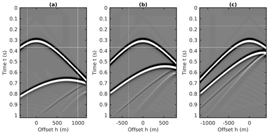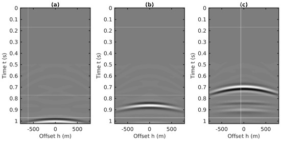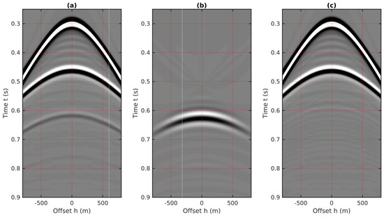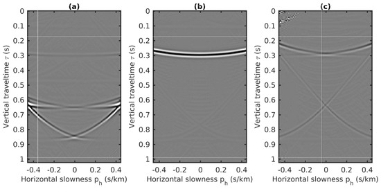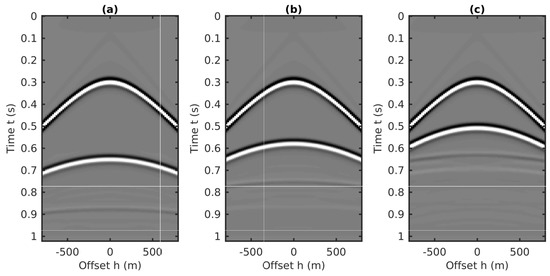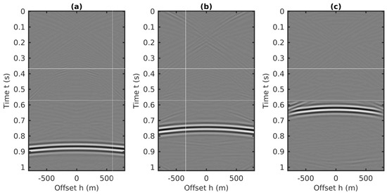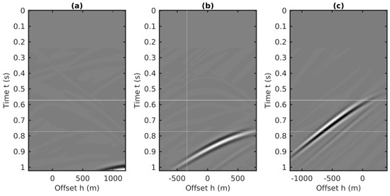 Similar to the 2D plane-wave predictions in source–receiver coordinates, the coupled plane-wave transform is applied to the CMP data volume, which results in a 3D data volume with respect to the horizontal slownesses (i.e., and , related to the CMP locations and half-offsets, respectively) and the vertical traveltime. Next, the transformed data volume is weighted by the factor to generate the final form of the input for the 2D prediction algorithm. Three common gathers extracted from this volume are plotted in Figure 17. Compared to the “butterfly” artifacts in the input related to source–receiver coordinates [26], the input of using the CMP gathers for internal multiples prediction has a similar aperture effects delineated as the cross-hyperbolic events in Figure 13, which can be eliminated by applying an attenuation taper on the limited aperture. Details of attenuating these butterfly effects caused by the finite aperture of the offset in the plane wave transformation can be found in [26].