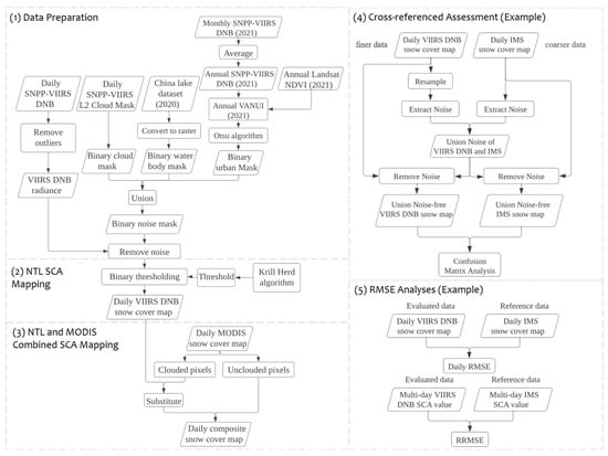 The workflow for producing snow maps in this study included three steps: (1) Data Preparation, (2) NTL SCA Mapping, and (3) NTL and MODIS combined SCA Mapping. We then evaluated the produced snow maps through (4) cross-referenced assessments and (5) RMSE analyses. A conceptual map of the steps taken is given in Figure 3. The left column of Figure 3. focuses on the three production steps that are further described in Section 2.3.1, Section 2.3.2 and Section 2.3.3.