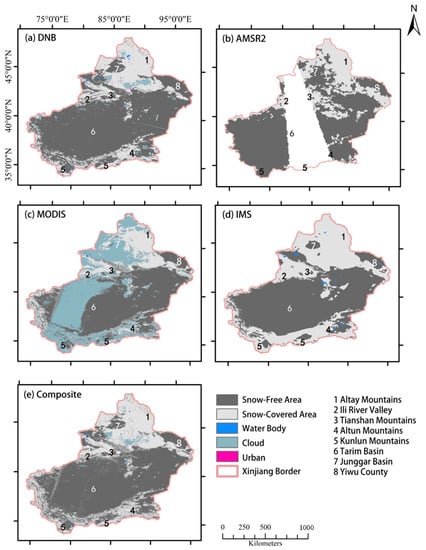 Figure 4a–e shows the snow distribution in Xinjiang based on VIIRS DNB, AMSR2, MODIS, IMS, and the composite map. Overall, the large spatial variability of snow distribution is captured in all four datasets. Large snow patches are mainly distributed in Northern Xinjiang and the Kunlun Mountains. Across Xinjiang, extensive snow cover could be detected in Altay Mountains, Ili River Valley, Tianshan Mountains, Altun Mountains, and Kunlun Mountains, while the main snow-free regions are Tarim Basin, Junggar Basin, and Yiwu County. The distribution of snow in Northern Xinjiang is more evenly and continuous, scoring higher SCA values, while in Southern Xinjiang, the distribution of snow tends to be more incoherent, presenting lower SCA values.