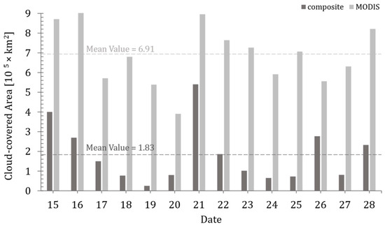 Despite the similar spatial characteristics among these five datasets (Figure 4), cloud coverage loomed the largest in MODIS (on average 42.21%), which considerably limited its spatial extent for SCA mapping. The results also suggest that among VIIRS DNB, MODIS, and AMSR2, the SCA values obtained using VIIRS DNB data are the closest to those of IMS maps. Furthermore, the results of Table 2 show that the composite data maps provided much lower cloud coverage (11.15%) than standard MODIS snow maps (42.21%), alleviating the data gaps of MODIS that were caused by cloud obscuration. The mean value of the cloud-covered area dropped markedly from 6.91 to 1.83 × 105 km2 (Figure 5). Meanwhile, the mean value of SCA increased considerably from 2.66 to 4.54 × 105 km2 (Table 2). Pixels available for providing snow cover distribution, namely the sum of snow-free pixels and snow-covered pixels, increased in all 14 days, with an average increasing percentage of 55.85% and approximately 46.57% on the full moon night.