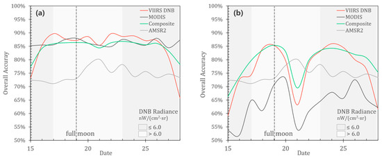 During cross-referenced assessments with clouded pixels omitted (Table 3), we found that over the whole course of the selected 14 days, VIIRS DNB and the composite maps substantially outperformed AMSR2 almost every day. However, when compared to MODIS (86.21%), the average overall accuracies of DNB (84.66%), and the composite maps (84.69%) were lower than MODIS by approximately 2%.