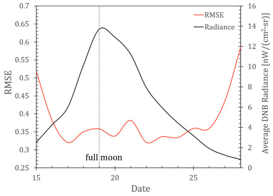 Lower RMSE values generally imply more precise predictions. In Table 7, the composite maps achieved the lowest mean RMSE, closely followed by MODIS and VIIRS DNB maps, and lastly, the AMSR2 dataset offered the highest RMSE values. These results are consistent with the clouded pixels omitted cross-referenced assessment results of Table 3, where VIIRS DNB, MODIS, and the composite maps achieved a similar level of overall accuracy and F-1 Score results that were superior to AMSR2. We plotted the daily variation of DNB radiance alongside RMSE in Figure 7, which shows a general decrease in RMSE and an increase in DNB radiance when close to the full moon occurrence. These tendencies are similar to those of the cross-referenced results in Section 3.2 (Figure 7).