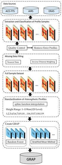 To address the issues of the existing reference atmospheric profile databases, such as long update periods, large spatial resolution and inadequate consideration of seasonal changes in spring and autumn, this article uses the ACE-FTS Level 2 Version 4.1 products in 2021 and 2022, the AIRS Support Level 2 Version 7 products, and ERA5 reanalysis data in 2022 to create the Global Reference Atmosphere Profile Database (GRAP) through the use of a random forest regression model and a stratified mean algorithm. The objective is to provide data support for research on global climate change and atmospheric component inversion.