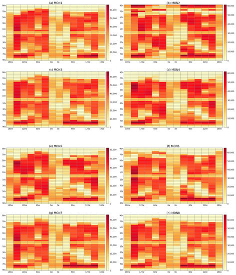 Temperature, pressure and volume mixing ratio (vmr) profiles of different atmospheric constituents are derived from the ACE-FTS, AIRS and ERA5 datasets. These profiles are then aligned with a standardized global grid, considering the detection time and latitude/longitude information, resulting in a dataset of 61 atmospheric profiles covering the entire globe. The extracted atmospheric profiles encompass data from all seasons throughout the year for 365 days, providing comprehensive spatial coverage. Figure 2 illustrates the distribution of CH4 profile samples across the global grid, spanning from January to December.