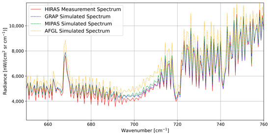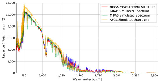 Figure 4 presents the comparison between the spectrum data obtained from HIRAS-II and the simulated spectrum of the RFM in the three atmospheric models across the full band range of 650–2550 cm−1. The results in Figure 4 indicate that the simulated spectrum of GRAP exhibits a much closer agreement with the measured spectrum from HIRAS-II.
