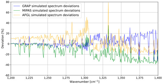 Deviation of the simulated and measured spectra of HIRAS-II in the 1200–1400 cm−1 band.