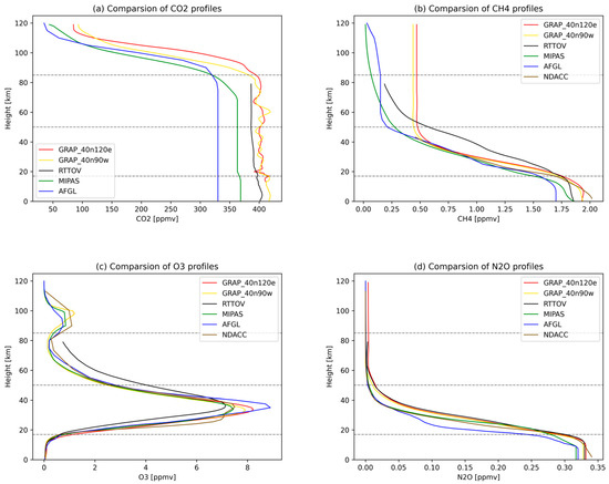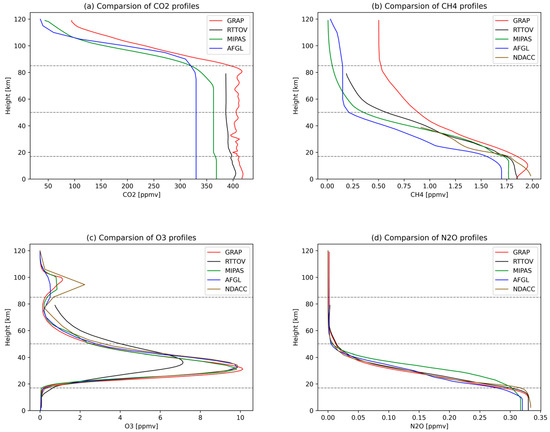 This article compares and analyzes the profiles of CO2, CH4, O3 and N2O in different latitude zones in the GRAP database, the AFGL database [22], the MIPAS database [31], the RTTOV database [32], and the profiles of CH4, O3 and N2O of the NDACC ground station in different latitude zones. It further selects and analyzes the temperature reference profiles of eight different grids in the Chinese region.