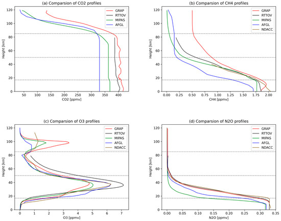 The CO2 profiles in Figure 9a exhibit overall consistency among the four databases. However, below 80 km altitude, the CO2 profile values of AFGL are 330 ppmv, whereas the CO2 profile values of MIPAS, RTTOV and GRAP are approximately 370 ppmv, 400 ppmv and 418 ppmv, respectively. There is a significant degree of difference between the four reference profiles. Between 80 and 120 km, the three reference CO2 profiles of GRAP, MIPAS and AFGL experience a rapid decrease, whereas the CO2 profile of GRAP remains higher than the other two profiles. Figure 9b presents the comparison of the CH4 profiles, showing that the shape of the GRAP CH4 profile resembles the other three profiles. However, its values are consistently higher from 0 to 120 km, peaking at approximately 1.95 ppmv in the troposphere. The primary focus of CH4 is in the troposphere, and the comparison between the four profiles and the observed profiles from the NDACC ground station reveals the smallest difference between the GRAP profile and the NDACC observations in the troposphere. Figure 9c indicates minimal differences in O3 profile values between GRAP and MIPAS, AFGL, NDACC, with the peak O3 concentrations occurring at 28–32 km. In contrast, the differences between the RTTOV reference atmospheric profiles and the other three reference profiles are more pronounced. Figure 9d illustrates that the N2O profile values of GRAP, RTTOV and NDACC are slightly larger than those of AFGL and MIPAS within the 0–15 km range, while MIPAS values are larger within the 15–45 km range, with N2O concentration reaching approximately zero above 50 km.