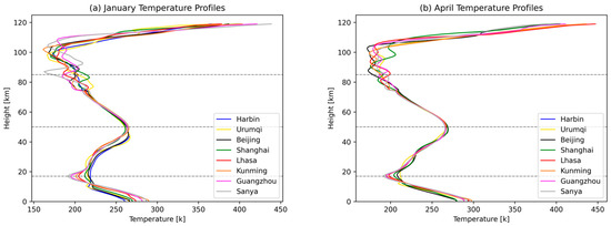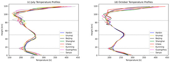 Figure 12 presents the comparison of reference temperature profiles for eight regions in China. Analysis of the figure reveals variations in surface temperatures (0 km) among all regions, with a maximum difference of 30 K occurring in winter, a minimum difference of only 15 K in summer, and approximately 20 K differences in both spring and autumn. In the troposphere, temperatures decrease with altitude, exhibiting the smallest variations in summer and a nearly parallel decreasing temperature profile. However, during spring, autumn and winter, a significant inflection point is observed around 10 km in Harbin, Urumqi, Beijing and Shanghai, where the rate of temperature decrease diminishes and even shows a rising trend. In the stratosphere, temperatures increase with altitude, displaying substantial differences between summer and winter. Harbin, Urumqi and Beijing exhibit significantly higher temperatures compared to the other five regions, while spring and autumn temperatures exhibit less disparity. In the mesosphere, temperatures decrease with altitude, reaching values of 160–190 K at the mesosphere’s upper boundary. Finally, in the thermosphere, temperatures rise rapidly with altitude, peaking at 440 K.