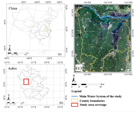 Location of the study area (a) in China and (b) in Anhui province and (c) the Sentinel-2 imagery representing 10 August 2020, over the study area. The figure was plotted by Arcmap10.4 software (projection: WGS84-based Universal Transverse Mercator Zone 49N).