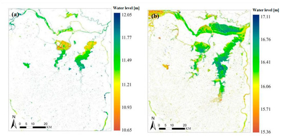 The water level measurement results based on the Stumpf model are shown in Figure 11. Figure 11a,b displays the water level measurement results in the study area pre- and post-flood. The results indicate that the water level height in the study area before the flood was between 10.65 and 12.05 m, and the water level height after the flood was between 15.36 and 17.11 m, an increase of approximately 4–6 m. Moreover, Yuan [40] demonstrated that the mean measurement error of ICESat-2 in water level measurements of lakes and reservoirs in China is 0.02 m. This indicates that flood-level measurement using ICESat-2 in this area is feasible and more reliable results can be obtained. The greatest increase in the water level was observed in Chengdong Lake and the northern part of Chengxi Lake, which are low-lying areas. The floodwater level was between 16.18 and 17.11 m. In particular, because of the narrow river channel in the Tanghu section of the Huaihe River and the southern part of Chengdong Lake, the sudden rise in water level caused by heavy rainfall is likely to cause the river to break its banks and inundate the surrounding areas. Additionally, the low-lying terrain of the region facilitates the accumulation of floodwater, resulting in the highest floodwater levels.