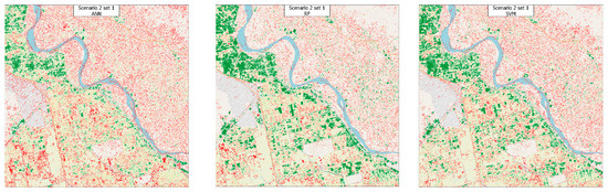 In this section, we present a visualization of the level of agreement among models for classifying irrigated agriculture in the Chokwe area. The images depict areas with varying degrees of green and red, with darker shades indicating higher agreement or disagreement among models (referred to as agreement maps), respectively. Specifically, the darkest green shade corresponds to areas where 25 models agreed on the classification of the pixel as irrigated agriculture, while the dark red shade indicates a classification by only one model. In cases where no red or green shades are present, it means that the pixel was classified as a different class other than irrigated agriculture. We have chosen to display only the first and last sets per scenario to illustrate the extremes.