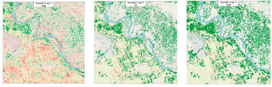 In Figure 15, we compare Scenario 4 set 4 (with 40% misclassification) with scenario 1 set 8 (with 0% misclassification) for reference. Scenario 4 set 4 (Figure 15 and Figure 16) shows that almost as much irrigated agriculture is classified on the north bank as the south bank, with all three algorithms, compared to the other scenarios. At the same time, there is less irrigated agriculture in the CIS, with more emphasis on heterogeneous areas for classifying irrigated agriculture.