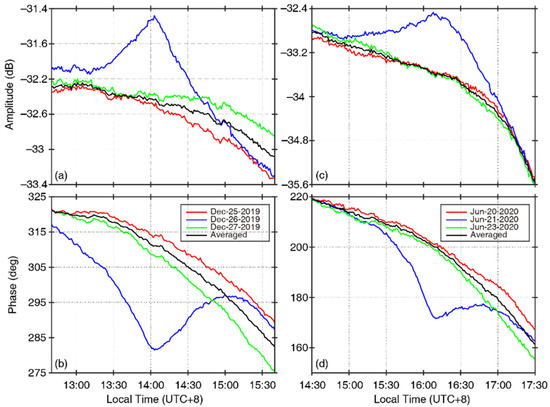 Following previous studies [45,47,48,49], we mainly focus on the net effects caused by solar eclipses, which are obtained by subtracting the baseline values from the eclipse-day measurements. The net amplitude and phase changes during the 2019 eclipse are shown as black lines in Figure 3a,b, respectively. We mainly focus on the net effects between 12:07 and 15:03 LT since the eclipse effects become prominent in this time period. Figure 2c,d and Figure 3c,d show similar results but for the 2020 eclipse event. For this eclipse, we mainly focus on the net effects between 14:28 and 17:28 LT. The amplitude change is approximately 1 dB for both eclipse events, whereas the phase change is ~29.6° for the 2019 eclipse and ~28.5° for the 2020 eclipse. These subtle differences may be related to the difference in the locations at which the totality path crossed the VLF propagation path (see Figure 1). The absolute value of VLF phase has been long found to be not steady [47,48] and phase instability has been observed, even for those transmitters in the United States [45], although they are usually considered to be highly phase stable [49]. Therefore, we investigate the relative change in VLF amplitude and phase in this study.