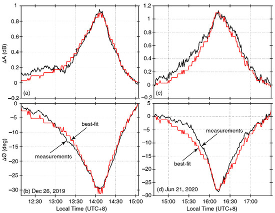 Comparison of (a) amplitude (∆A) and (b) phase changes (∆ϕ) between modeling results and real measurements during the solar eclipse on 26 December 2019. Panels (c,d) show similar results but for the eclipse that occurred on 21 June 2020.