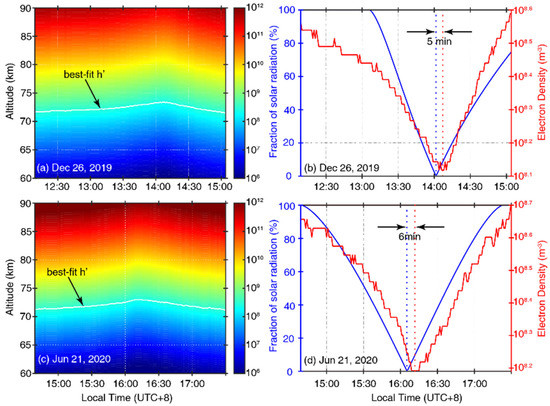Figure 4c,d show similar results but for the 2020 eclipse. The best-fit β value is 0.62 km−1, and the h′ value changed from 71.1 to 72.8 km during this eclipse. As shown in Figure 4d, the electron density change at 73 km altitude follows more closely with the variation in solar input during this eclipse. The time difference is approximately 6 min between 100% obscuration of solar input (~16:05 LT) and VLF response (~16:11 LT). As the temporal resolution of VLF data used in the present analysis is 1 min, we consider this time difference as being consistent with the 2019 event.