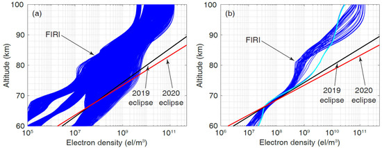 To examine if the best-fit h′ and β values were reasonable, we compared the inversion results with the FIRI model [60], previous studies [30,31,33,35,64,67,68], as well as theoretical calculations [69]. Figure 5a shows the comparison of electron density profiles between the FIRI profiles and the pre-eclipse profiles that we found for the 2019 and 2020 solar eclipses, whereas Figure 5b shows the profiles that were close to the best-fit profiles derived from VLF measurements. FIRI represented, to date, the most accurate model for the D-region electron density. As clearly shown in Figure 5b, in the altitude range that was critical for VLF reflection during daytime conditions (65–75 km), the pre-eclipse ionospheric profiles that we found for the 2019 and 2020 eclipse events were consistent with the FIRI model, especially the curve marked in cyan.