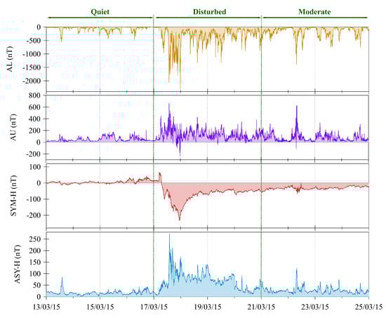 Figure 1 depicts the scenario well. It shows the trend of four different geomagnetic indices over the selected time interval: AL, AU, SYM-H and ASY-H, respectively. These indices, which are available from the World Data Center for Geomagnetism (WDCG), Kyoto University, Japan (http://swdcwww.kugi.kyoto-u.ac.jp/index.html, accessed on 30 March 2023) have one-minute time resolution and describe various physical processes or current systems that tend to activate and/or intensify in response to solar activity. The horizontal components of the magnetic field at six mid-latitude stations are used to calculate the SYM-H and ASY-H indices, which mainly account for the disturbances to the geomagnetic field caused by the development of the magnetospheric ring current. SYM-H is similar to Dst. They are calculated in similar but not identical ways. SYM-H has the distinct advantage of having a 1 min time resolution as opposed to Dst’s 1 h time resolution [,]. However, while the SYM-H index describes geomagnetic disturbances at mid latitudes longitudinally symmetric to the dipole axis, the ASY-H index describes the disturbance on the horizontal component after the symmetrical part is subtracted from the disturbance field. The AU and AL indices, which are derived from horizontal variation of the geomagnetic field observed at selected (10–13) stations along the auroral zone in the Northern Hemisphere, are defined as the upper (AU) and lower envelopes (AL) of the superposed plots of all the data from these stations as functions of universal time (UT). They are used as a proxy for auroral activity because they are an indirect measure of the intensity of the auroral electrojets moving eastward and westward, respectively. The values assumed by these indices between 13 and 24 March 2015 reveal the existence of days with low geomagnetic activity (from 13 to 16 March 2015), based on the low values of the SYM-H index (above −10 nT), days with high geomagnetic disturbance (from 17 to 20 March 2015),which includes the well-known magnetic storm of 17 March 2015, also known as the St. Patrick’s Day storm, and days with moderate geomagnetic activity (from 21 to 24 March 2015), characterized by the combined observations of SYM-H < −10 nT and AU, |AL| 200 nT.