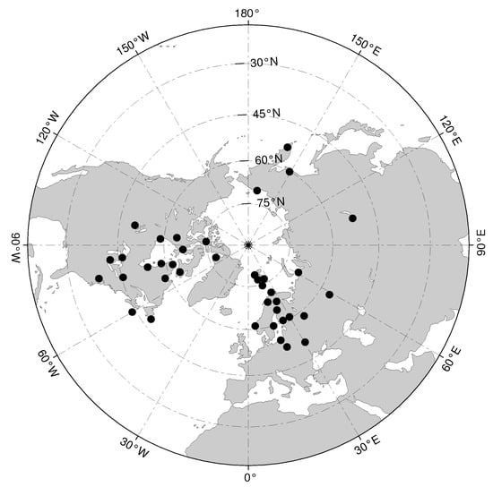 In this work, we look at the geographic North (X) and geographic East (Y) components of the Earth’s magnetic field in the geodetic reference frame, as measured via magnetometers at permanent observatories and magnetometer stations located in the Northern Hemisphere. When using magnetic data recorded on the ground, it is known that the distribution of the selected stations is uneven. In fact, there are large geographic gaps in the network of magnetic stations, most of which are found in oceanic areas. To avoid emphasizing the uneven distribution of the magnetic stations across the Northern Hemisphere, we only choose a portion of the available stations that are located in Europe and North America. Figure 2 shows the geographical distribution of the selected stations while a list of them is shown in Table 1. Each measurement site is identified by its International Association of Geomagnetism and Aeronomy (IAGA) code and includes information such as geographical and geomagnetic coordinates, magnetic local time and the database from which data were downloaded. In detail, we considered the quasi-dipole (QD) coordinate system, which is based on magnetic apex coordinates [].