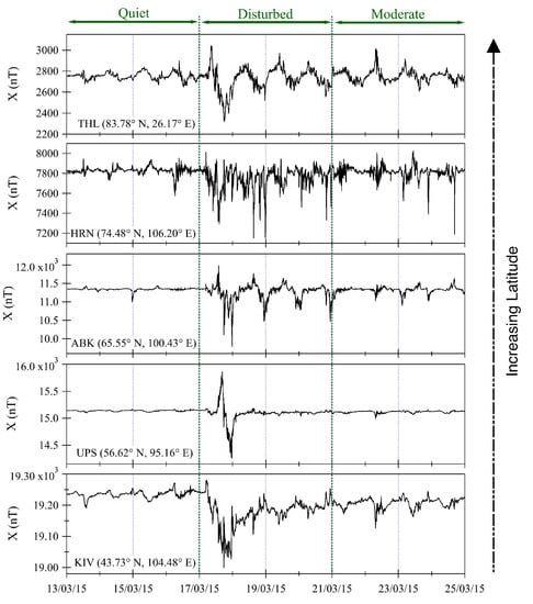 The X component of the geomagnetic field measured at five different observatories between 13 and 24 March 2015, located at different magnetic latitudes (increasing from bottom to top). The green dotted lines demarcate time intervals distinguished by different levels of geomagnetic activity.