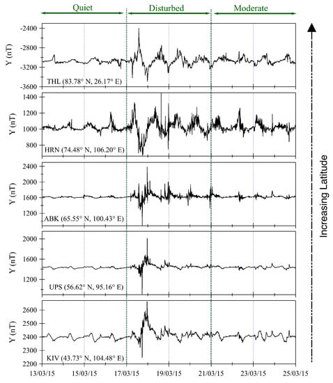 The Y component of the geomagnetic field measured at five different observatories between 13 and 24 March 2015, located at different magnetic latitudes (increasing from bottom to top). The green dotted lines demarcate time intervals distinguished by different levels of geomagnetic activity.