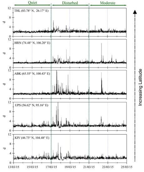 The instantaneous dimensions d evaluated at five different observatories between 13 and 24 March 2015. The green dotted lines demarcate time intervals distinguished by different levels of geomagnetic activity.