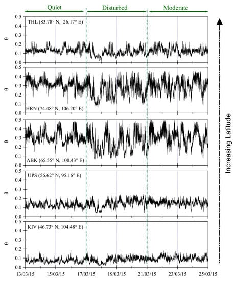 The dynamical behavior of the extremal index also displays an interesting and intriguing behavior, both comparing disturbed and quiet periods as well as across magnetic latitudes. The first feature that emerges is a clear 1-day variability at latitudes around 60–70N, as shown in Figure 6 for ABK and HRN. This can be attributed to the daily variability observed in the solar quiet (Sq) current system whose center is located at mid latitude but whose maximum variability is observed around the boundary of the auroral oval []. This 1-day variability is destroyed when the geomagnetic storm occurs [], reflecting the large-amplitude short-term variability caused by the triggering activity of the solar wind external forcing []. Lower extremal index values are observed at low latitudes and in the polar cap region (e.g., THL), implying that more stable conditions are observed related to the center of the northern lobe of the Sq (at lower latitudes) and the presence of Sun-aligned arcs in the polar cap region []. Another interesting feature is that at the end of the main phase of the geomagnetic storm (i.e., when the minimum SYM-H value is reached) all latitudes have extremely low values of (i.e., ), indicating the overall response of the geomagnetic field variations to the strong driver induced by the solar wind. This is consistent with the delayed response time of geomagnetic activity at different latitudes when the internal response time of the magnetosphere–ionosphere system is considered [,,]. Finally, larger amplitude fluctuations around the mean are observed for geomagnetic stations located at the boundary of the auroral oval as a result of the short-term high-amplitude variability of the geomagnetic field observed at these latitudes. These more unstable dynamics (i.e., larger values with larger fluctuations) are caused by contributions from various current systems with boundaries close to the auroral oval. Finally, unlike the instantaneous dimensions, d, the extremal index, , cannot be used as a proxy for distinguishing the different levels of geomagnetic active periods, assuming similar values during both the disturbed and moderate periods of activity.
