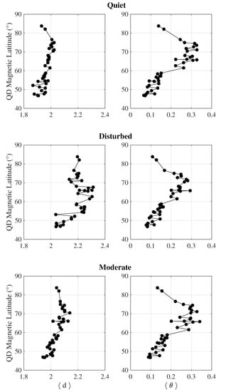 The average dimension (left panels) and the average inverse persistence (right panels) as a function of the geomagnetic latitude during the quiet (top), the disturbed (middle) and the moderate (bottom) periods of geomagnetic activity.
