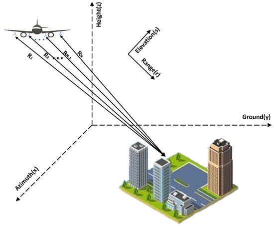 The airborne array TomoSAR obtains elevation resolution from the cross-heading array antenna, and then combines the 2D imaging of the traditional SAR to achieve the 3D resolution of the target scene. The array antenna generally adopts MIMO mode to form multiple virtual antenna phase centers []. The imaging Geometric model of the airborne array TomoSAR is shown in Figure 1, which has N data acquisition channels. There are two different coordinate systems in the figure. The geodetic coordinate system represent azimuth, ground, and height.The radar coordinate system represents azimuth, range, and elevation. The two coordinate systems follow the principle of the right-hand coordinate system.