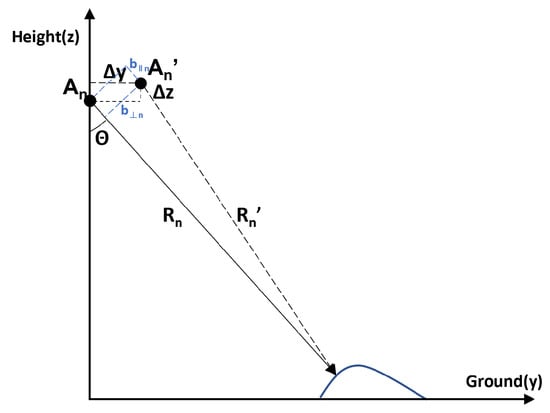 In addition, the phase center position errors of each channel antenna, caused by the baseline position measurement errors when the carrier is moving, will result in the spatially varying phase errors in the SLC image after the 2D imaging of each channel. The side-looking plane geometry diagram is shown in Figure 3.