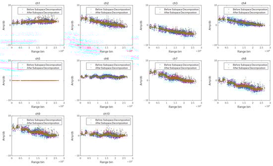 The next step is to extract the amplitude-phase inconsistency information at each prominent point using the above amplitude-phase inconsistency extraction Algorithm 2. The following Figure 9 shows the result of the inconsistency of the amplitude of ch1∼ch10. Blue points represent the result of extracting the amplitude information directly from the prominent point, and red points represent the result of subspace decomposition mentioned above. It can be obviously seen that after subspace decomposition, the distribution of amplitude points is more convergent, indicating that it is less easily disturbed by noise, and the extracted amplitude inconsistency results are more accurate.