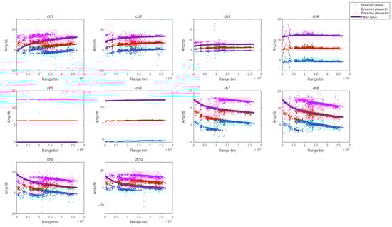 The results of the multi-channel amplitude-phase inconsistency at the prominent points obtained using the previous process are discretely distributed with the range. It is necessary to fit the changing curve for compensating the amplitude-phase inconsistency errors of the whole scene in the range. The fitting method mainly uses polynomial curve fitting and combines random sample consensus to avoid the interference of error points. Accurate fitting can also be performed by manually selecting feature points. The following Figure 11 and Figure 12, are the results of the polynomial fitting of the amplitude, and the phase inconsistency of each channel with the range. For phase inconsistency, the change is discontinuous due to the phase ambiguity. Therefore, it is necessary to increase the original phase inconsistency by one or two ambiguity periods , and then to fit the complete change curve.