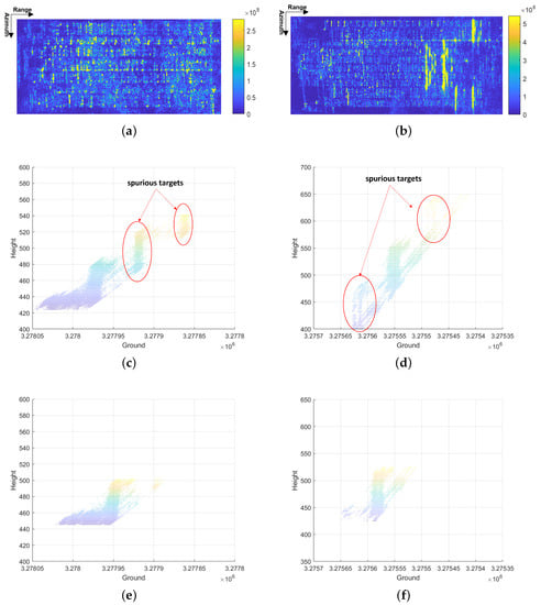 In the following, Figure 14 is a comparison of the three-dimensional reconstruction results of two single buildings in the imaging scene. Figure 14a,b are the 2D SAR images of the two buildings that are located in the green frames ① and ② in Figure 7, respectively. Figure 14c,d are the 3D reconstruction point cloud of buildings after the calibration via method 1. Figure 14e,f are the 3D reconstruction point clouds of buildings after the calibration via method 2. It can be seen that there are multiple spurious targets (in red circles) in the reconstruction results after calibration via method 1, while the reconstruction results after the calibration via method 2 exist only one building. There is no ghosting problem after the calibration via method 2. It is worth mentioning that there are still some stray points in the point cloud after calibration, which may be caused by multiple scattering between adjacent building facades. Here are the original point cloud results without any further post-processing.