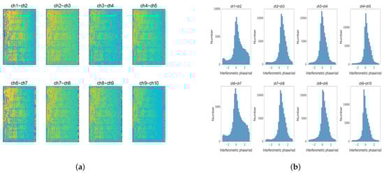 Interferograms of adjacent channels after calibration using the proposed method. (a) Interferograms; (b) Histograms of interferograms.