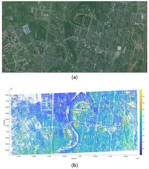 This section will take the airborne array TomoSAR flight experimental data from a certain place in Sichuan Province of China as an example, to verify the effectiveness of the proposed method. The selected experimental scene is shown in Figure 7, and the scale is about 3 km × 2 km. There are many buildings and artificial facilities distributed in the selected scene. Therefore, there are enough prominent points that meet the conditions to choose.