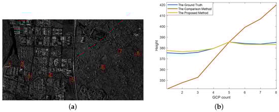 The reconstructed heights of GCPs. (a) The distribution of GCPs (as red numbers show); (b) The comparison results of GCPs’ heights.