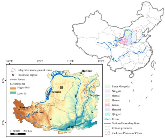 Its elevation descends from northwest to southeast, and it has a typical semi-arid continental monsoon climate, with annual precipitation of 150–750 mm. The dominant ecosystem service of this region is the soil retention service [,]. The maximum soil erosion area of the Loess Plateau used to reach about 390,000 km2 because of large-scale deforestation from the second half of the 14th century to the first half of the 20th century, which has seriously threatened the ecological security of the mid-lower reaches of the Yellow River []. The Loess Plateau covers 7 provincial-level regions, with a total population of 114 million up to 2018. The region is a dry farming production area in China []. This region is also one of the areas where the Western Development Strategy is implemented. Based on the outline of the comprehensive management plan of the Loess Plateau, combined with the geographic profile of each province, the Loess Plateau was divided into six comprehensive management zones, including the valley plain region, the loess hilly gully region, the sand and desert region, the earth-rock mountain region, the agricultural irrigation region, and the loess gully region [].