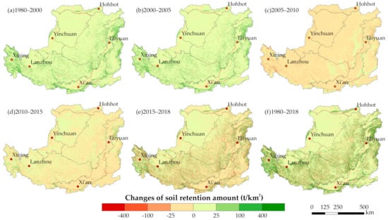 Spatial distribution of changes in soil retention amount on the Loess Plateau. (a) Before the implementation of the Grain for Green program during 1980–2000, (b–e) after the Grain for Green program during 2000–2018, and (f) the whole study period for 1980–2018. The soil retention service showed an increasing trend before the implementation of the Grain for Green program and a fluctuant upward trend after the Grain for Green program.