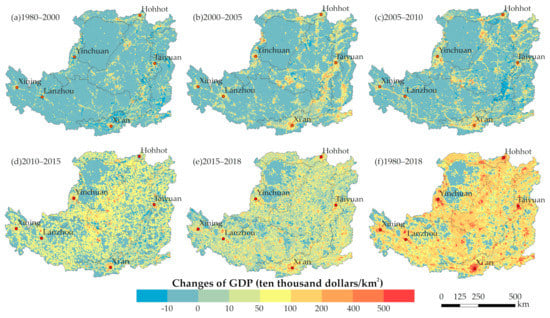 Changes in the spatial distribution of gross domestic product in the Loess Plateau for periods (a) 1980–2000, (b) 2000–2005, (c) 2005–2010, (d) 2010–2015, (e) 2015–2018, and (f) 1980–2018. After 2000, the gross domestic product increased substantially, nearly for the whole region, especially for the urban center and surrounding regions.