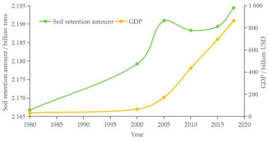 Economic development of the Loess Plateau demonstrated a continuous growth trend for 1980–2018, but the soil retention service showed a fluctuant increase, which appeared to be a slight decline for 2005–2010 (Figure 4). For 1980–2000, the soil retention growth amount was about 20.00 t/km2, and the GDP growth speed was relatively slow. For 2000–2018, the soil retention amount increased to 24.24 t/km2, and the average annual growth rate of the GDP came up to 67.50%. A win–win situation of soil retention and economic development was achieved in the Loess Plateau of China during this period.