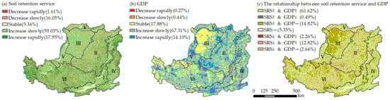 As seen in Figure 5c, the soil retention service and GDP increased jointly in 61.62% of the study area, which was mainly distributed in the loess gully and loess hilly gully regions. The regions where soil retention services were rising while the GDP remained stable, accounting for 14.82%, were mainly located in the sandy and desert region. The percentage of regions where the GDP continued to grow while soil retention declined was 12.82%, with the maximum distribution in the loess gully, loess hilly gully, and earth-rock mountain regions. Overall, the simultaneous improvement in the soil retention service and economic status was the dominant trend in the Loess Plateau.