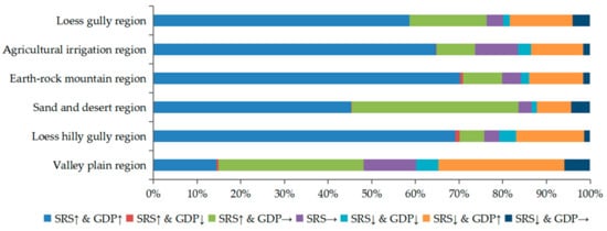 As revealed by Figure 6, the synchronous growth of the soil retention service and GDP dominated in each integrated management zone, especially in the loess hilly gully and earth-rock mountain regions, reaching nearly 70%. Compared to other integrated management zones, the valley plain and sand desert region had a large proportion of areas where the soil retention service was boosted and the GDP remained stable, accounting for 33.31% and 38.24%, respectively. The smallest proportion was the simultaneous decline in the soil retention service and GDP. In addition, it can also be found that the valley plain has a large proportion of soil retention service decreasing and GDP increasing.