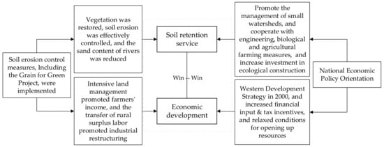 Exploring the complex relationship between ecological restoration and economic development is valuable for decision makers to formulate policy for sustainable development. The large-scale environmental restoration program—Grain for Green—was mainly implemented in the Loess Plateau of China to improve the soil retention service. However, whether this world-famous program affects local economic development has not been fully explored. In this study, using the Integrated Valuation of Ecosystem Services and Tradeoffs (InVEST) model and spatializing the gross domestic product (GDP) based on the remotely sensed nightlight data, we explored the tradeoff between environment (i.e., soil retention service) and economy (i.e., GDP) for the Loess Plateau in a spatially explicit way. We found that the soil retention service increased prominently over the past 40 years, especially after implementing the Grain for Green project. Meanwhile, the GDP increased about nine-fold over the past four decades from 4.52 to 40.29 × 107 USD. A win–win situation of soil retention and economic development was achieved in the Loess Plateau of China, particularly in the loess gully and loess hilly gully regions of the Loess Plateau. The win–win situation of soil retention and economic development was as a result of the Grain for Green program, the optimization of industrial structure, and the increase in non-agriculture employment. Compared with previous studies, more spatial information was available for the Loess Plateau in this study, which is more valuable to policymakers.