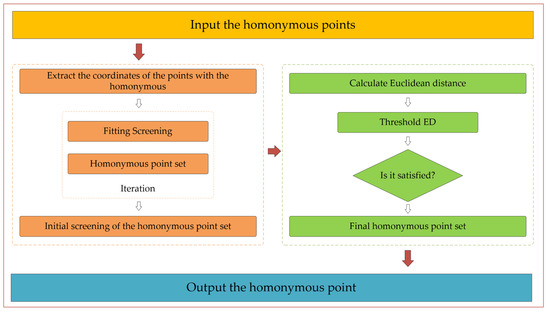 In Equation (6), are the coordinates of the homonymous points on the reference image, and are the coordinates of the homonymous points on the image to be aligned after the transformation of Equation (5). Figure 2 shows the algorithm flow.