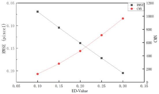 ED value verification chart. The relationship between the ED value and RMSE is shown on the left side of the image axis, and the relationship between the ED value and the Correct Matching Number (CMN) is established on the right side. ED-Value is the threshold value used for secondary screening of the homologous points.