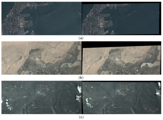 - Two adjacent frames of the condition data of the three land cover types listed in Section 3, sea, desert, and mountain, are selected for homologous point detection to obtain 19,599, 18,197, and 12,169 homologous point pairs each, respectively.